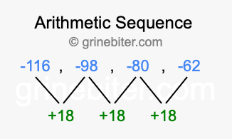 So, what type of sequence is -116, -98, -80, -62? The sequence -116, -98, -80, -62 has a common difference of +18 between each term. We call this kind of sequence an arithmetic sequence. Below is an image illustrating the correlation between the arithmetic sequence -116, -98, -80, -62 and its common difference of +18.