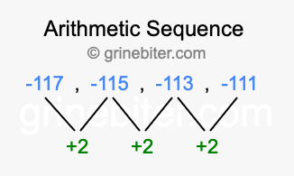 So, what type of sequence is -117, -115, -113, -111? The sequence -117, -115, -113, -111 has a common difference of +2 between each term. We call this kind of sequence an arithmetic sequence. Below is an image illustrating the correlation between the arithmetic sequence -117, -115, -113, -111 and its common difference of +2.