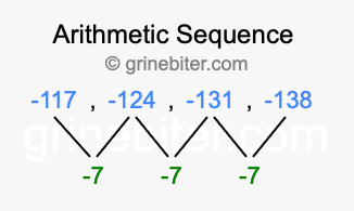 So, what type of sequence is -117, -124, -131, -138? The sequence -117, -124, -131, -138 has a common difference of -7 between each term. We call this kind of sequence an arithmetic sequence. Below is an image illustrating the correlation between the arithmetic sequence -117, -124, -131, -138 and its common difference of -7.