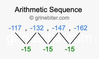 So, what type of sequence is -117, -132, -147, -162? The sequence -117, -132, -147, -162 has a common difference of -15 between each term. We call this kind of sequence an arithmetic sequence. Below is an image illustrating the correlation between the arithmetic sequence -117, -132, -147, -162 and its common difference of -15.