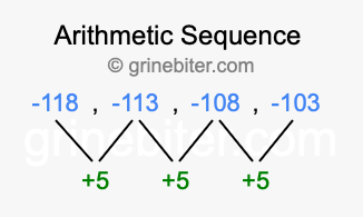 So, what type of sequence is -118, -113, -108, -103? The sequence -118, -113, -108, -103 has a common difference of +5 between each term. We call this kind of sequence an arithmetic sequence. Below is an image illustrating the correlation between the arithmetic sequence -118, -113, -108, -103 and its common difference of +5.