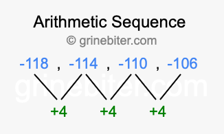 So, what type of sequence is -118, -114, -110, -106? The sequence -118, -114, -110, -106 has a common difference of +4 between each term. We call this kind of sequence an arithmetic sequence. Below is an image illustrating the correlation between the arithmetic sequence -118, -114, -110, -106 and its common difference of +4.