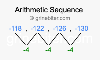 So, what type of sequence is -118, -122, -126, -130? The sequence -118, -122, -126, -130 has a common difference of -4 between each term. We call this kind of sequence an arithmetic sequence. Below is an image illustrating the correlation between the arithmetic sequence -118, -122, -126, -130 and its common difference of -4.