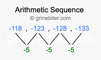 So, what type of sequence is -118, -123, -128, -133? The sequence -118, -123, -128, -133 has a common difference of -5 between each term. We call this kind of sequence an arithmetic sequence. Below is an image illustrating the correlation between the arithmetic sequence -118, -123, -128, -133 and its common difference of -5.