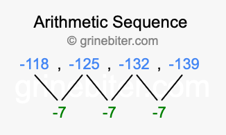 So, what type of sequence is -118, -125, -132, -139? The sequence -118, -125, -132, -139 has a common difference of -7 between each term. We call this kind of sequence an arithmetic sequence. Below is an image illustrating the correlation between the arithmetic sequence -118, -125, -132, -139 and its common difference of -7.