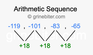 So, what type of sequence is -119, -101, -83, -65? The sequence -119, -101, -83, -65 has a common difference of +18 between each term. We call this kind of sequence an arithmetic sequence. Below is an image illustrating the correlation between the arithmetic sequence -119, -101, -83, -65 and its common difference of +18.