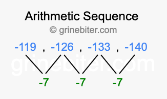 So, what type of sequence is -119, -126, -133, -140? The sequence -119, -126, -133, -140 has a common difference of -7 between each term. We call this kind of sequence an arithmetic sequence. Below is an image illustrating the correlation between the arithmetic sequence -119, -126, -133, -140 and its common difference of -7.