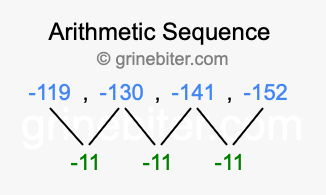 So, what type of sequence is -119, -130, -141, -152? The sequence -119, -130, -141, -152 has a common difference of -11 between each term. We call this kind of sequence an arithmetic sequence. Below is an image illustrating the correlation between the arithmetic sequence -119, -130, -141, -152 and its common difference of -11.