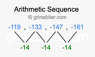 So, what type of sequence is -119, -133, -147, -161? The sequence -119, -133, -147, -161 has a common difference of -14 between each term. We call this kind of sequence an arithmetic sequence. Below is an image illustrating the correlation between the arithmetic sequence -119, -133, -147, -161 and its common difference of -14.