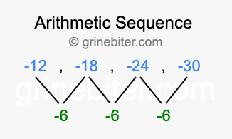 So, what type of sequence is -12, -18, -24, -30? The sequence -12, -18, -24, -30 has a common difference of -6 between each term. We call this kind of sequence an arithmetic sequence. Below is an image illustrating the correlation between the arithmetic sequence -12, -18, -24, -30 and its common difference of -6.