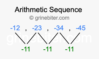 So, what type of sequence is -12, -23, -34, -45? The sequence -12, -23, -34, -45 has a common difference of -11 between each term. We call this kind of sequence an arithmetic sequence. Below is an image illustrating the correlation between the arithmetic sequence -12, -23, -34, -45 and its common difference of -11.