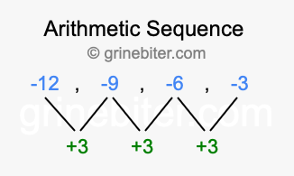 So, what type of sequence is -12, -9, -6, -3? The sequence -12, -9, -6, -3 has a common difference of +3 between each term. We call this kind of sequence an arithmetic sequence. Below is an image illustrating the correlation between the arithmetic sequence -12, -9, -6, -3 and its common difference of +3.