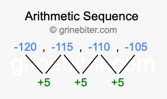 So, what type of sequence is -120, -115, -110, -105? The sequence -120, -115, -110, -105 has a common difference of +5 between each term. We call this kind of sequence an arithmetic sequence. Below is an image illustrating the correlation between the arithmetic sequence -120, -115, -110, -105 and its common difference of +5.
