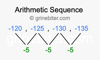 So, what type of sequence is -120, -125, -130, -135? The sequence -120, -125, -130, -135 has a common difference of -5 between each term. We call this kind of sequence an arithmetic sequence. Below is an image illustrating the correlation between the arithmetic sequence -120, -125, -130, -135 and its common difference of -5.