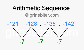 So, what type of sequence is -121, -128, -135, -142? The sequence -121, -128, -135, -142 has a common difference of -7 between each term. We call this kind of sequence an arithmetic sequence. Below is an image illustrating the correlation between the arithmetic sequence -121, -128, -135, -142 and its common difference of -7.