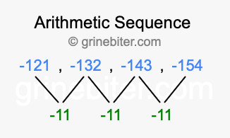 So, what type of sequence is -121, -132, -143, -154? The sequence -121, -132, -143, -154 has a common difference of -11 between each term. We call this kind of sequence an arithmetic sequence. Below is an image illustrating the correlation between the arithmetic sequence -121, -132, -143, -154 and its common difference of -11.