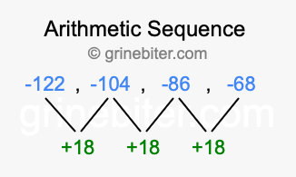 So, what type of sequence is -122, -104, -86, -68? The sequence -122, -104, -86, -68 has a common difference of +18 between each term. We call this kind of sequence an arithmetic sequence. Below is an image illustrating the correlation between the arithmetic sequence -122, -104, -86, -68 and its common difference of +18.