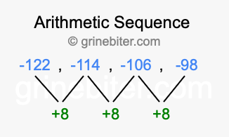 So, what type of sequence is -122, -114, -106, -98? The sequence -122, -114, -106, -98 has a common difference of +8 between each term. We call this kind of sequence an arithmetic sequence. Below is an image illustrating the correlation between the arithmetic sequence -122, -114, -106, -98 and its common difference of +8.
