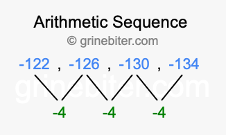 So, what type of sequence is -122, -126, -130, -134? The sequence -122, -126, -130, -134 has a common difference of -4 between each term. We call this kind of sequence an arithmetic sequence. Below is an image illustrating the correlation between the arithmetic sequence -122, -126, -130, -134 and its common difference of -4.