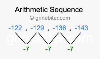 So, what type of sequence is -122, -129, -136, -143? The sequence -122, -129, -136, -143 has a common difference of -7 between each term. We call this kind of sequence an arithmetic sequence. Below is an image illustrating the correlation between the arithmetic sequence -122, -129, -136, -143 and its common difference of -7.