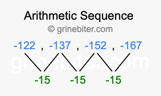 So, what type of sequence is -122, -137, -152, -167? The sequence -122, -137, -152, -167 has a common difference of -15 between each term. We call this kind of sequence an arithmetic sequence. Below is an image illustrating the correlation between the arithmetic sequence -122, -137, -152, -167 and its common difference of -15.