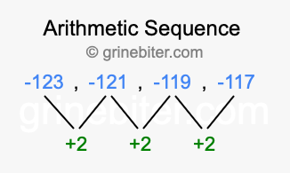 So, what type of sequence is -123, -121, -119, -117? The sequence -123, -121, -119, -117 has a common difference of +2 between each term. We call this kind of sequence an arithmetic sequence. Below is an image illustrating the correlation between the arithmetic sequence -123, -121, -119, -117 and its common difference of +2.
