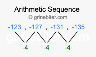 So, what type of sequence is -123, -127, -131, -135? The sequence -123, -127, -131, -135 has a common difference of -4 between each term. We call this kind of sequence an arithmetic sequence. Below is an image illustrating the correlation between the arithmetic sequence -123, -127, -131, -135 and its common difference of -4.