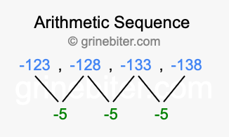 So, what type of sequence is -123, -128, -133, -138? The sequence -123, -128, -133, -138 has a common difference of -5 between each term. We call this kind of sequence an arithmetic sequence. Below is an image illustrating the correlation between the arithmetic sequence -123, -128, -133, -138 and its common difference of -5.