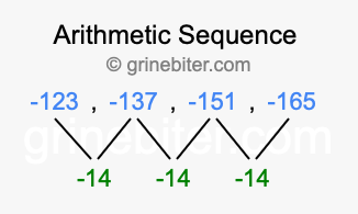 So, what type of sequence is -123, -137, -151, -165? The sequence -123, -137, -151, -165 has a common difference of -14 between each term. We call this kind of sequence an arithmetic sequence. Below is an image illustrating the correlation between the arithmetic sequence -123, -137, -151, -165 and its common difference of -14.