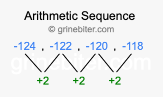 So, what type of sequence is -124, -122, -120, -118? The sequence -124, -122, -120, -118 has a common difference of +2 between each term. We call this kind of sequence an arithmetic sequence. Below is an image illustrating the correlation between the arithmetic sequence -124, -122, -120, -118 and its common difference of +2.