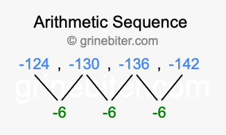 So, what type of sequence is -124, -130, -136, -142? The sequence -124, -130, -136, -142 has a common difference of -6 between each term. We call this kind of sequence an arithmetic sequence. Below is an image illustrating the correlation between the arithmetic sequence -124, -130, -136, -142 and its common difference of -6.