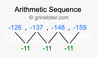 So, what type of sequence is -126, -137, -148, -159? The sequence -126, -137, -148, -159 has a common difference of -11 between each term. We call this kind of sequence an arithmetic sequence. Below is an image illustrating the correlation between the arithmetic sequence -126, -137, -148, -159 and its common difference of -11.