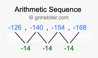 So, what type of sequence is -126, -140, -154, -168? The sequence -126, -140, -154, -168 has a common difference of -14 between each term. We call this kind of sequence an arithmetic sequence. Below is an image illustrating the correlation between the arithmetic sequence -126, -140, -154, -168 and its common difference of -14.
