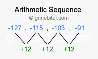 So, what type of sequence is -127, -115, -103, -91? The sequence -127, -115, -103, -91 has a common difference of +12 between each term. We call this kind of sequence an arithmetic sequence. Below is an image illustrating the correlation between the arithmetic sequence -127, -115, -103, -91 and its common difference of +12.