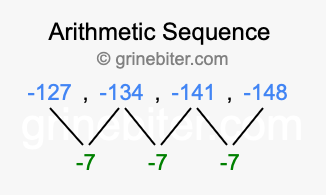So, what type of sequence is -127, -134, -141, -148? The sequence -127, -134, -141, -148 has a common difference of -7 between each term. We call this kind of sequence an arithmetic sequence. Below is an image illustrating the correlation between the arithmetic sequence -127, -134, -141, -148 and its common difference of -7.