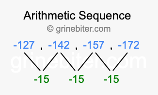 So, what type of sequence is -127, -142, -157, -172? The sequence -127, -142, -157, -172 has a common difference of -15 between each term. We call this kind of sequence an arithmetic sequence. Below is an image illustrating the correlation between the arithmetic sequence -127, -142, -157, -172 and its common difference of -15.