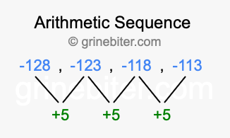 So, what type of sequence is -128, -123, -118, -113? The sequence -128, -123, -118, -113 has a common difference of +5 between each term. We call this kind of sequence an arithmetic sequence. Below is an image illustrating the correlation between the arithmetic sequence -128, -123, -118, -113 and its common difference of +5.