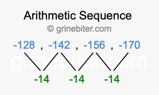 So, what type of sequence is -128, -142, -156, -170? The sequence -128, -142, -156, -170 has a common difference of -14 between each term. We call this kind of sequence an arithmetic sequence. Below is an image illustrating the correlation between the arithmetic sequence -128, -142, -156, -170 and its common difference of -14.