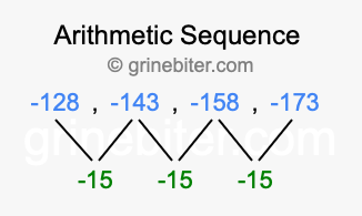 So, what type of sequence is -128, -143, -158, -173? The sequence -128, -143, -158, -173 has a common difference of -15 between each term. We call this kind of sequence an arithmetic sequence. Below is an image illustrating the correlation between the arithmetic sequence -128, -143, -158, -173 and its common difference of -15.