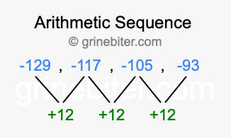 So, what type of sequence is -129, -117, -105, -93? The sequence -129, -117, -105, -93 has a common difference of +12 between each term. We call this kind of sequence an arithmetic sequence. Below is an image illustrating the correlation between the arithmetic sequence -129, -117, -105, -93 and its common difference of +12.