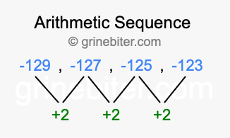 So, what type of sequence is -129, -127, -125, -123? The sequence -129, -127, -125, -123 has a common difference of +2 between each term. We call this kind of sequence an arithmetic sequence. Below is an image illustrating the correlation between the arithmetic sequence -129, -127, -125, -123 and its common difference of +2.