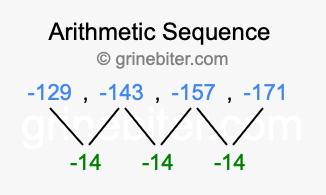 So, what type of sequence is -129, -143, -157, -171? The sequence -129, -143, -157, -171 has a common difference of -14 between each term. We call this kind of sequence an arithmetic sequence. Below is an image illustrating the correlation between the arithmetic sequence -129, -143, -157, -171 and its common difference of -14.