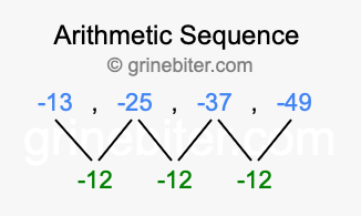 So, what type of sequence is -13, -25, -37, -49? The sequence -13, -25, -37, -49 has a common difference of -12 between each term. We call this kind of sequence an arithmetic sequence. Below is an image illustrating the correlation between the arithmetic sequence -13, -25, -37, -49 and its common difference of -12.