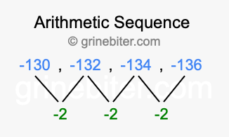 So, what type of sequence is -130, -132, -134, -136? The sequence -130, -132, -134, -136 has a common difference of -2 between each term. We call this kind of sequence an arithmetic sequence. Below is an image illustrating the correlation between the arithmetic sequence -130, -132, -134, -136 and its common difference of -2.