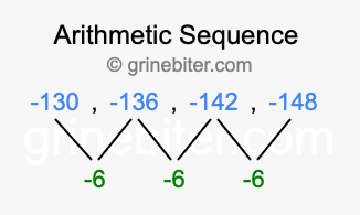So, what type of sequence is -130, -136, -142, -148? The sequence -130, -136, -142, -148 has a common difference of -6 between each term. We call this kind of sequence an arithmetic sequence. Below is an image illustrating the correlation between the arithmetic sequence -130, -136, -142, -148 and its common difference of -6.