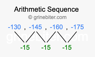 So, what type of sequence is -130, -145, -160, -175? The sequence -130, -145, -160, -175 has a common difference of -15 between each term. We call this kind of sequence an arithmetic sequence. Below is an image illustrating the correlation between the arithmetic sequence -130, -145, -160, -175 and its common difference of -15.