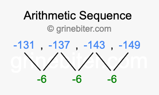 So, what type of sequence is -131, -137, -143, -149? The sequence -131, -137, -143, -149 has a common difference of -6 between each term. We call this kind of sequence an arithmetic sequence. Below is an image illustrating the correlation between the arithmetic sequence -131, -137, -143, -149 and its common difference of -6.