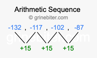 So, what type of sequence is -132, -117, -102, -87? The sequence -132, -117, -102, -87 has a common difference of +15 between each term. We call this kind of sequence an arithmetic sequence. Below is an image illustrating the correlation between the arithmetic sequence -132, -117, -102, -87 and its common difference of +15.