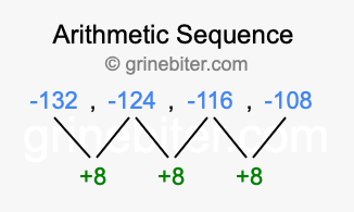 So, what type of sequence is -132, -124, -116, -108? The sequence -132, -124, -116, -108 has a common difference of +8 between each term. We call this kind of sequence an arithmetic sequence. Below is an image illustrating the correlation between the arithmetic sequence -132, -124, -116, -108 and its common difference of +8.