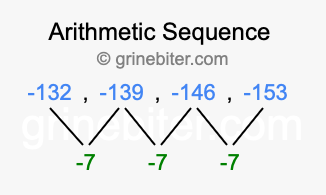 So, what type of sequence is -132, -139, -146, -153? The sequence -132, -139, -146, -153 has a common difference of -7 between each term. We call this kind of sequence an arithmetic sequence. Below is an image illustrating the correlation between the arithmetic sequence -132, -139, -146, -153 and its common difference of -7.